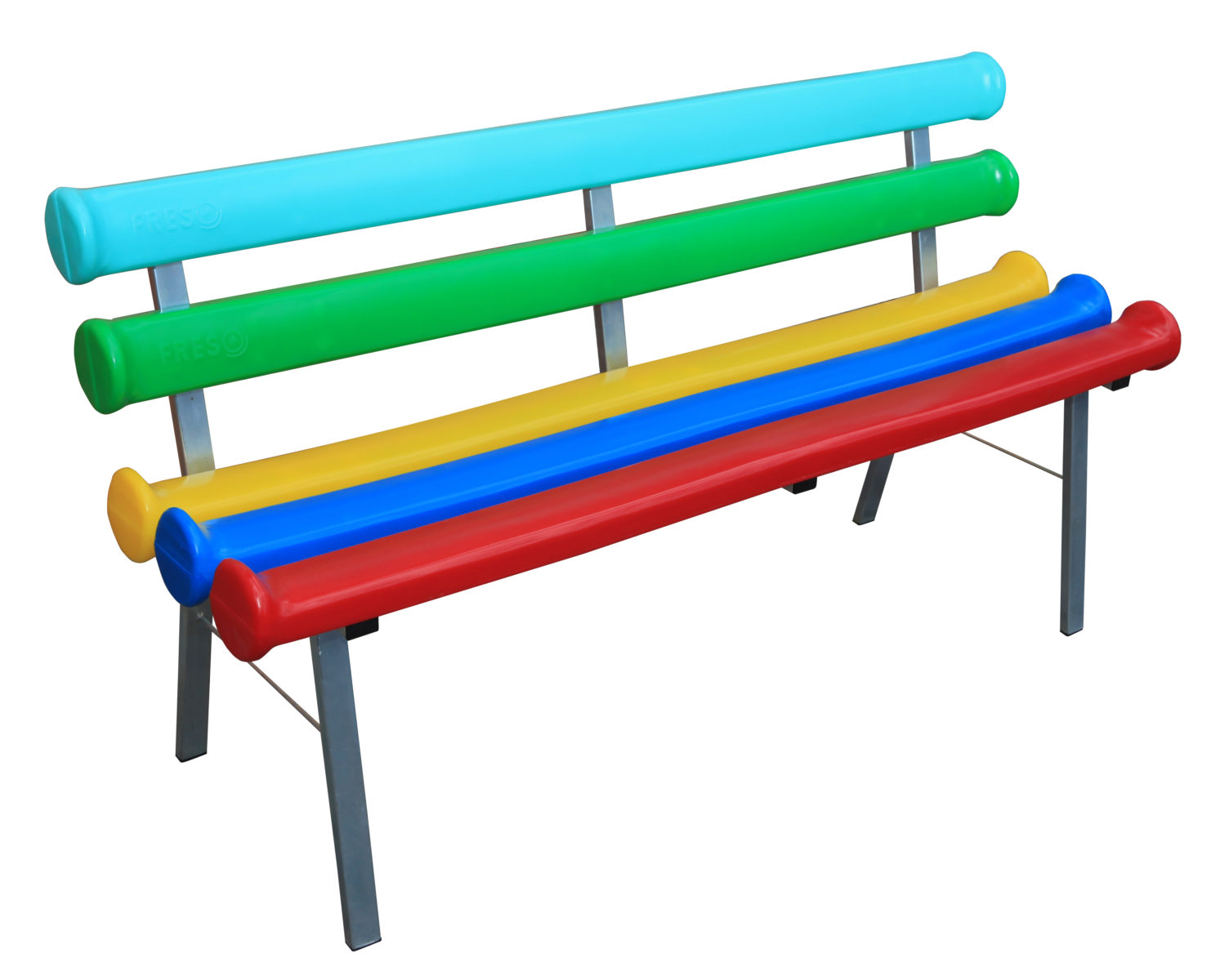 Banco com as 3 tiras do assento e as 2 do encosto em formato de toras de madeira coloridas, levemente arredondadas para maior conforto.