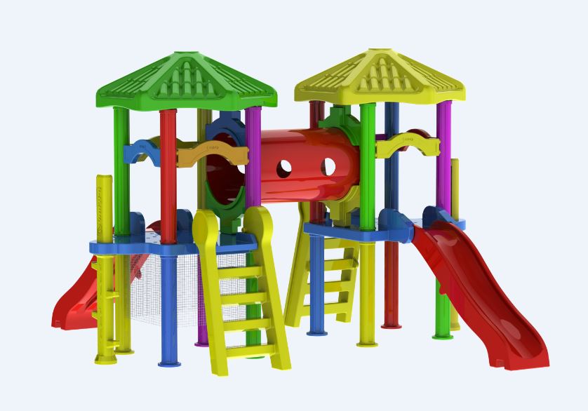 A escalada desse brinquedo é uma verdadeira aventura. A criança tem a sensação de escalar uma grande montanha para em seguida deslizar suavemente pelas suas encostas com formato de escorregador, além do tubo de transição que interliga os 2 módulos ainda tem um balancinho!