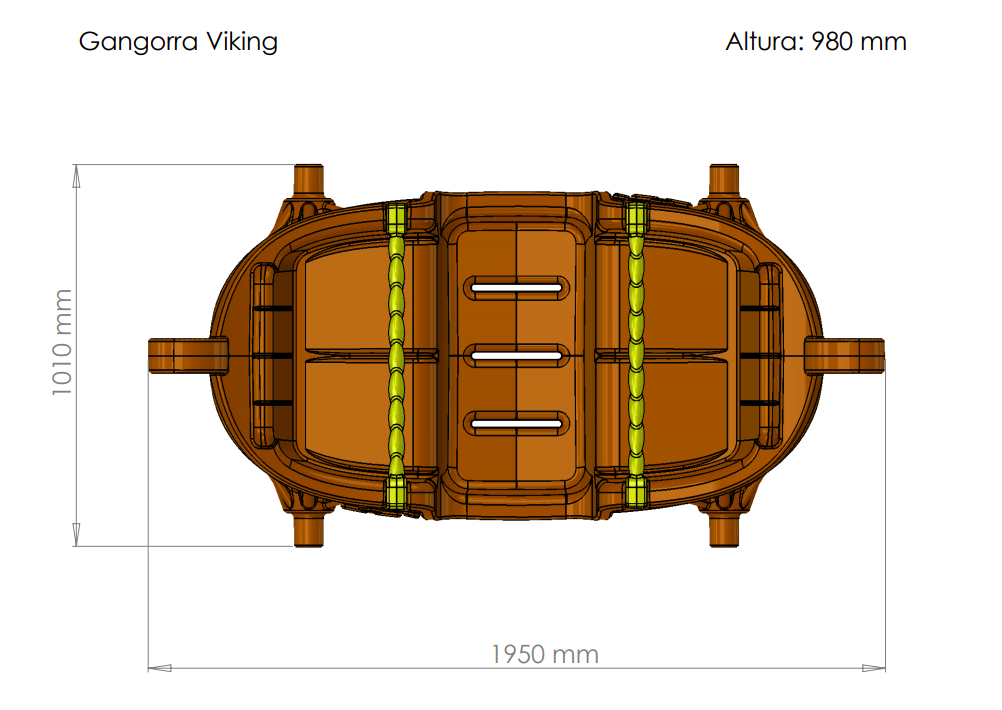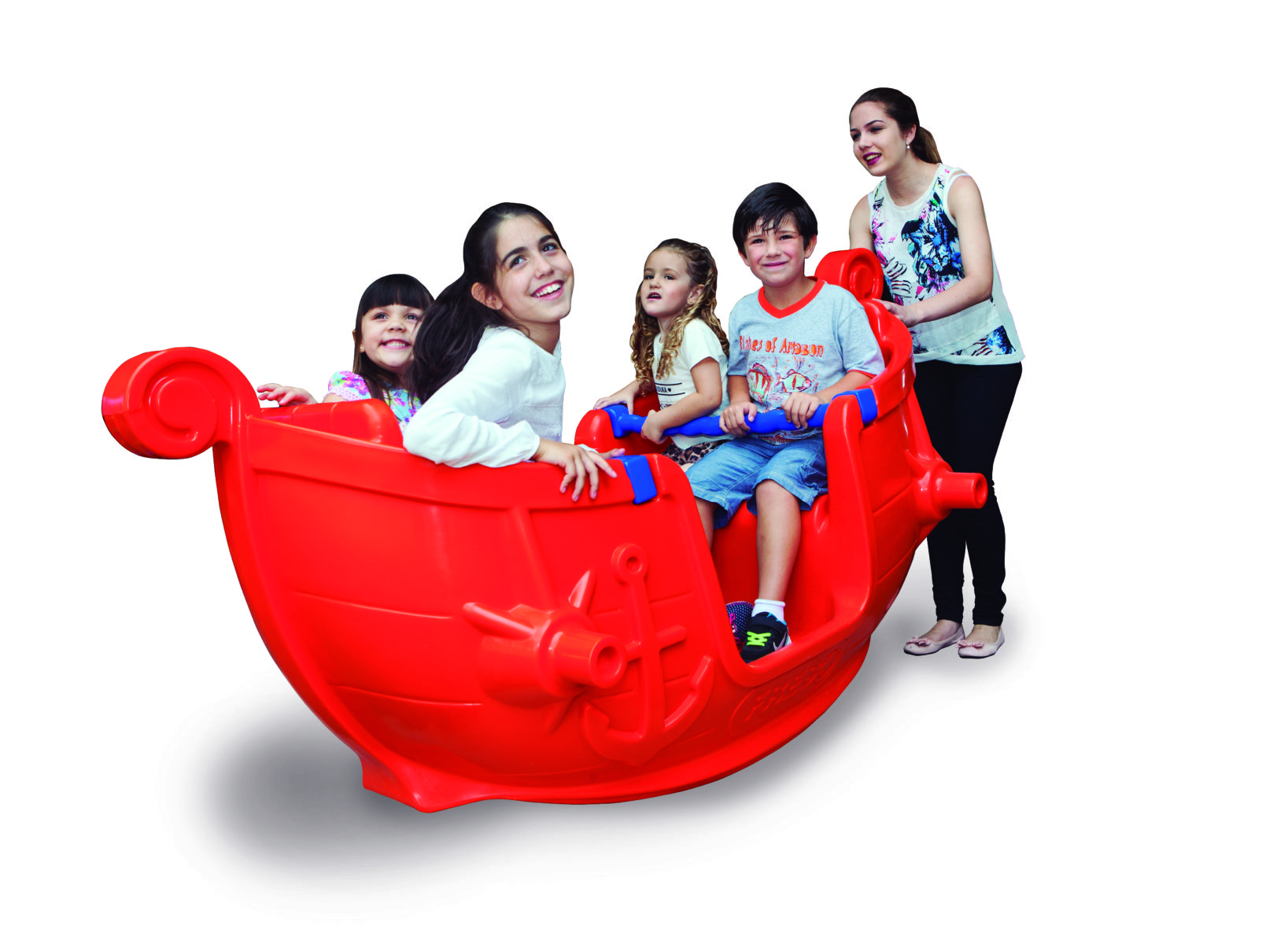 Uma linda gangorra para 4 crianças em forma de barco viking para estimular a imaginação e criatividade das crianças contendo 2 bancos posicionados frente a frente com 2 assentos cada um, com uma trave de segurança em forma de corda naval para impedir que as crianças caiam dos assentos, canaletas centrais, nos contornos dos assentos e fendas no piso para impedir acúmulo de água, alto relevo nas laterais em forma de ancora, 2 saliências externas em cada lateral na altura dos assentos para instalação no suporte previamente preparado para transformá-la em balanço. Fundo côncavo para permitir um balanço suave e com 2 saliencias nas extremidades inferiores que funcionam como bloqueio para evitar tombamento. Distancia de 1,30m entre encostos, abertura central de 0,44m para acesso aos assentos.