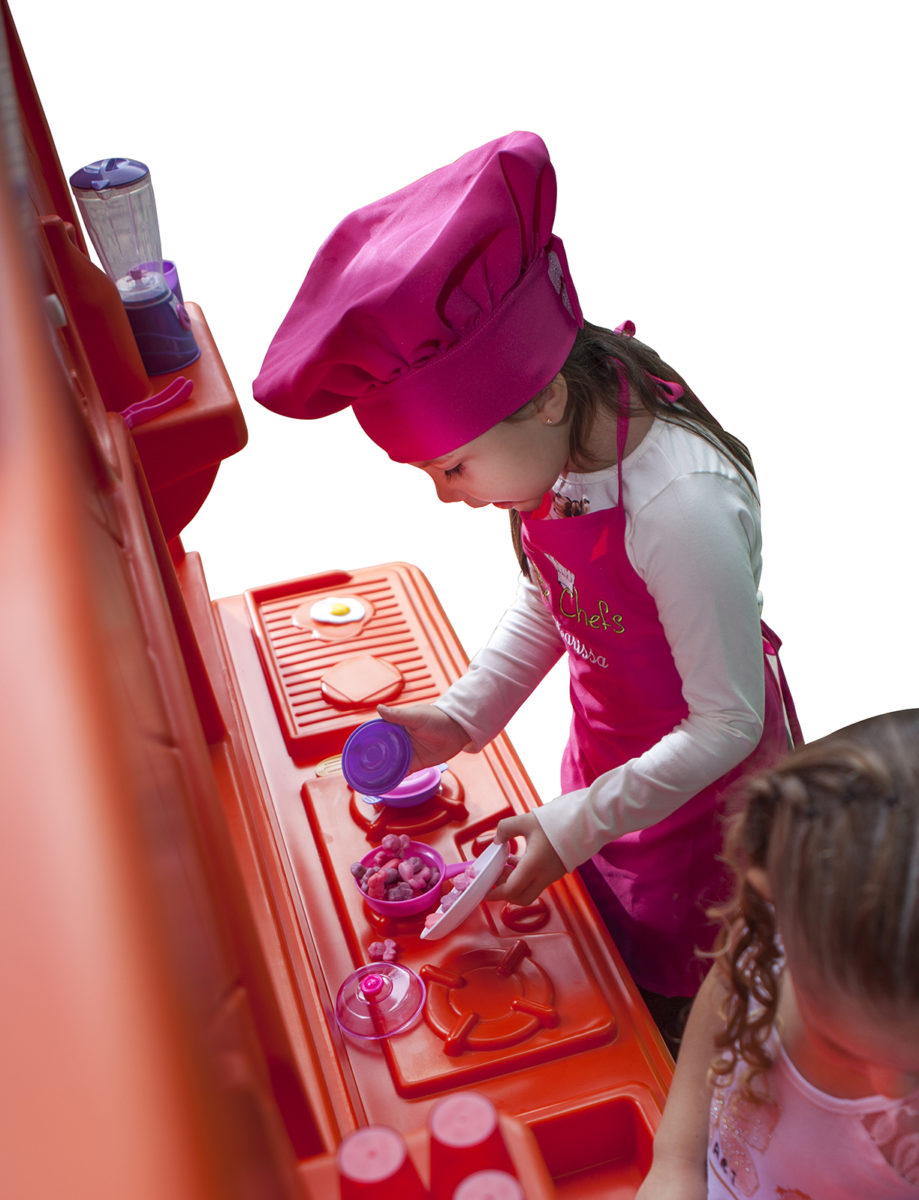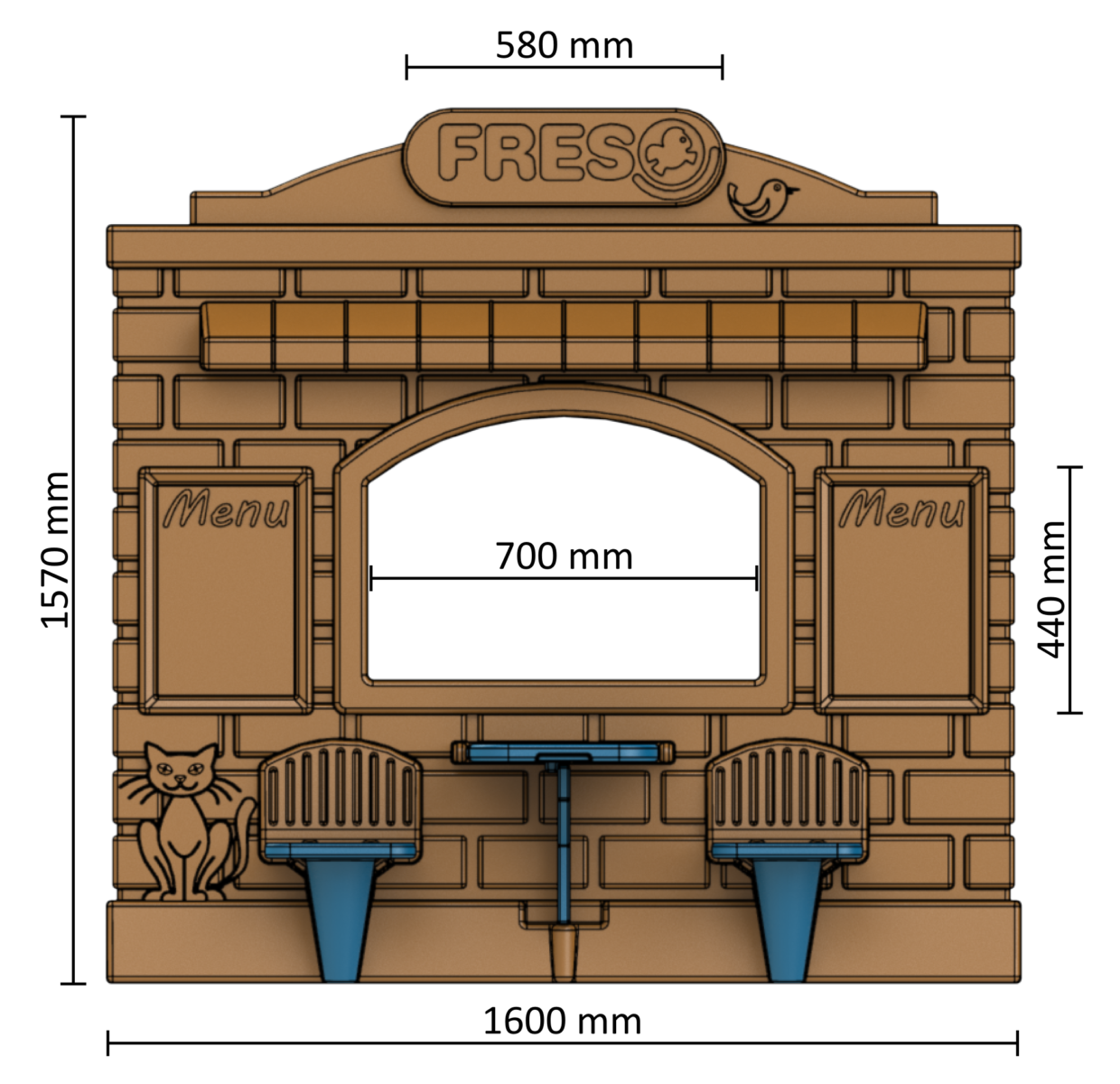• uma parede contendo internamente pia, fogão de 3 bocas, escorredor de pratos, chapa com alto-relevo simulando x-burger e ovo frito, relógio com ponteiros móveis, tampa de forno em alto-relevo, 2 nichos retangulares, 2 prateleiras altas com garrafas em alto-relevo, portinhas de micro-ondas e frigobar, ampla abertura que permite visualização da parte externa. A parte externa contém 1 mesinha retrátil, 2 banquinhos fixos, ampla janela, 2 quadros de aviso para escrever, figura de gatinho em alto-relevo e pequena saliência em forma de toldo.