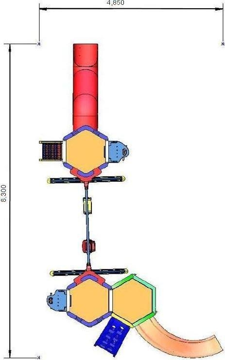 • 2 paredes grandes unidas pela plataforma sextavada e por 2 arcos de segurança. Em um deles é acoplado o módulo médio e no outro é acoplada uma pequena plataforma para instalação da escada de degraus alternados ou escada tradicional